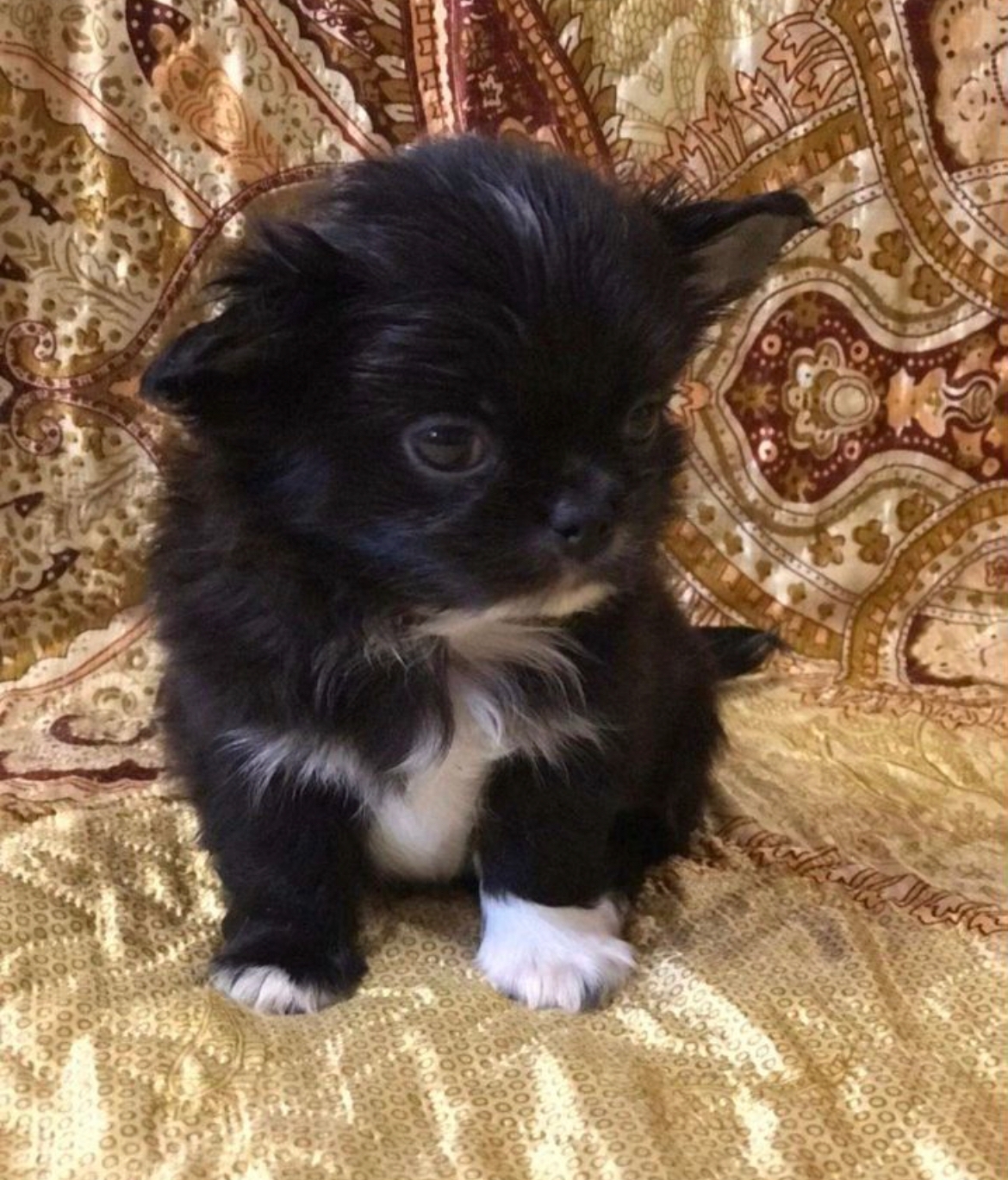 Мальчик чихуахуа длиношерстный. Будет мелкий стандарт. Окрас чёрный с белым. Без брака. Весь пакет документов. Прививки сделаны по возрасту. Щенок приучен гигиене. Активный, игривый, ласковый. Без агрессии к другим животным.